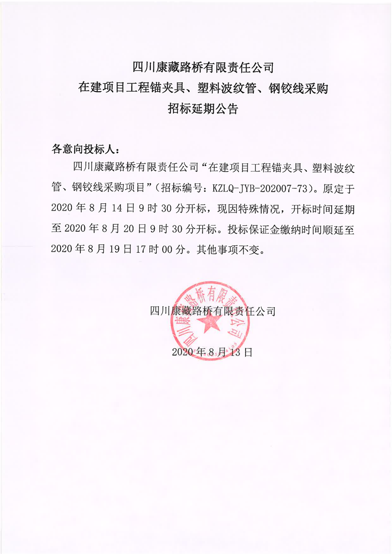 四川康藏路橋有限責(zé)任公司在建項(xiàng)目工程錨夾具、塑料波紋管、鋼鉸線采購招標(biāo)延期公告