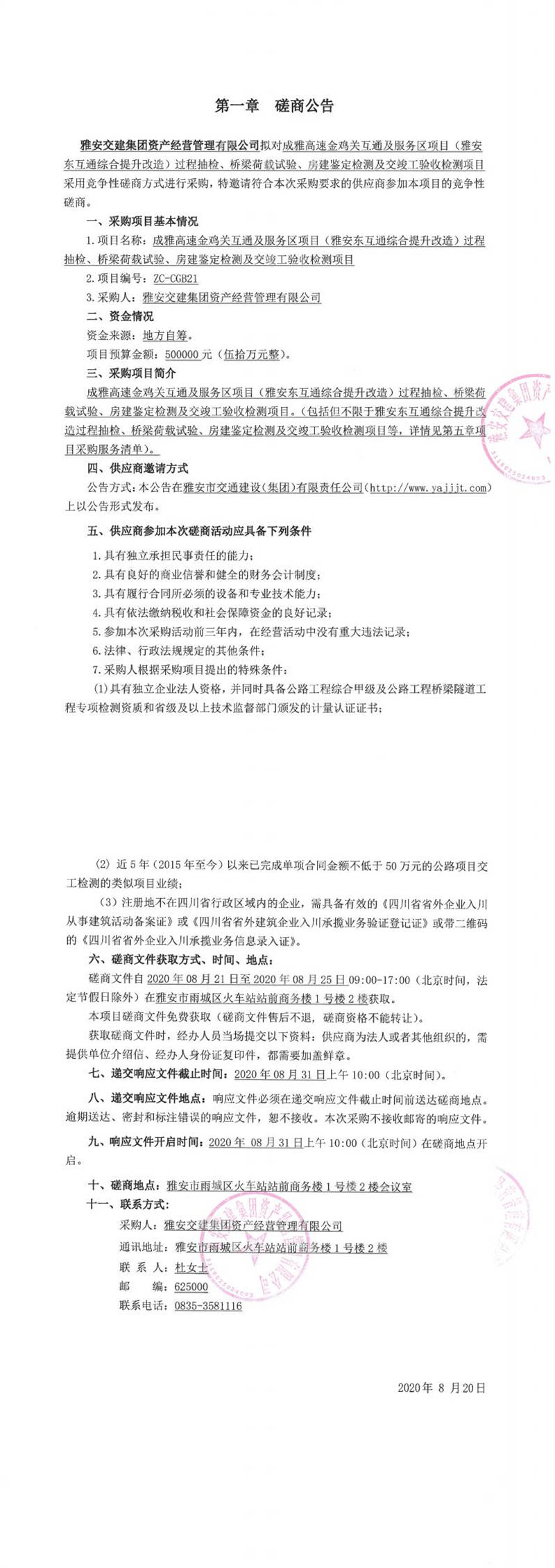 雅安交建集團資產(chǎn)經(jīng)營管理有限公司成雅高速金雞關互通及服務區(qū)項目(雅安東互通綜合提升改造)過程抽檢、橋梁荷載試驗、房建鑒定檢測及交竣工驗收檢測項目磋商公告