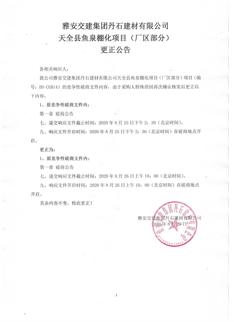 雅安交建集團(tuán)丹石建材有限公司天全縣魚(yú)泉棚化項(xiàng)目(廠(chǎng)區(qū)部分)更正公告