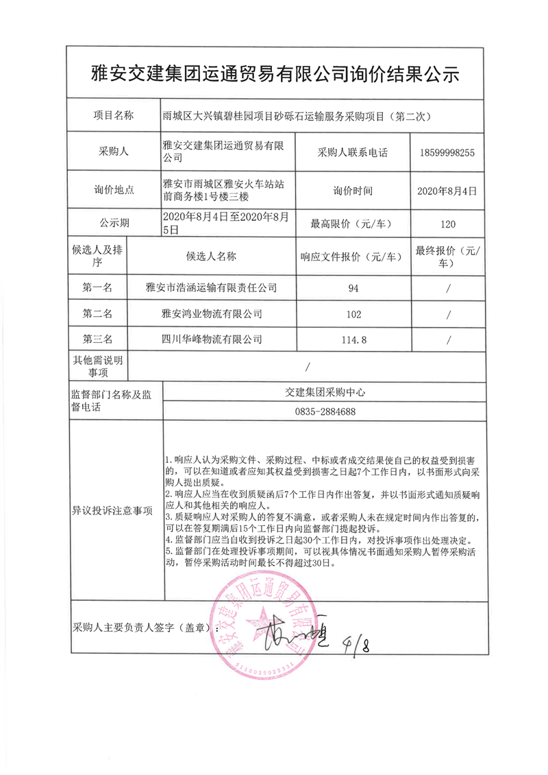 雅安交建集團運通貿(mào)易有限公司雨城區(qū)大興鎮(zhèn)碧桂園項目砂礫石運輸服務采購項目(第二次)詢價結(jié)果公示