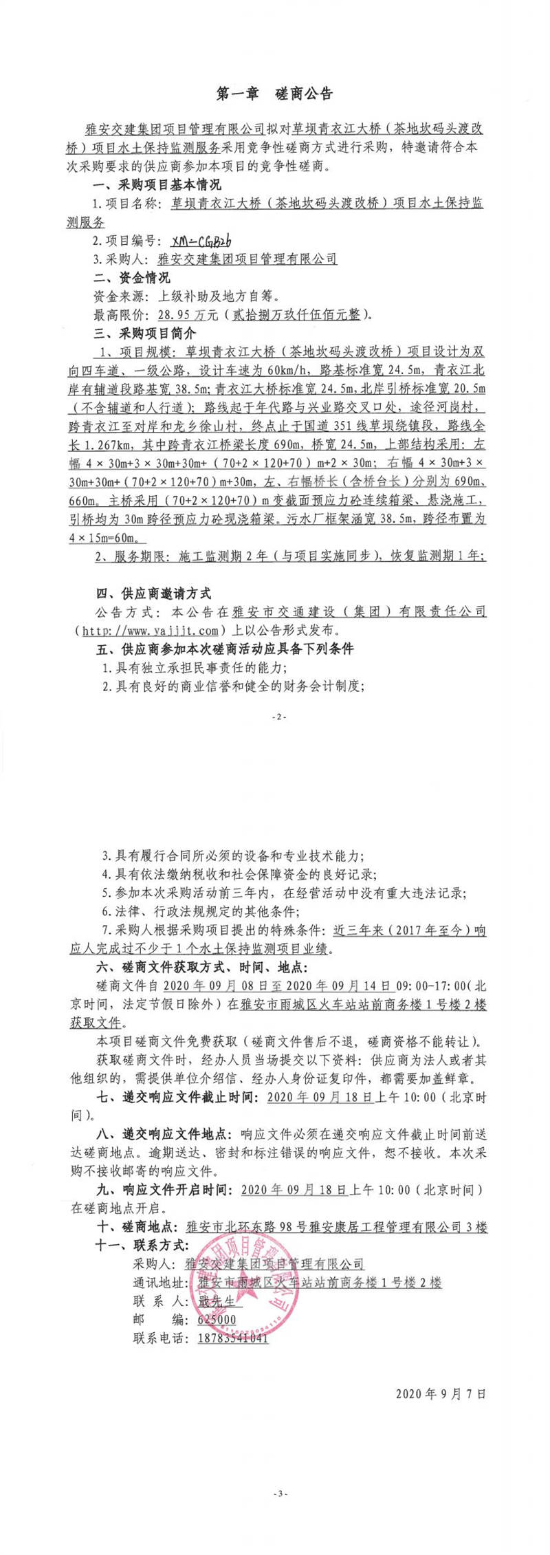 雅安交建集團(tuán)項目管理有限公司草壩青衣江大橋(茶地坎碼頭渡改橋)項目水土保持監(jiān)測服務(wù)競爭性磋商公告