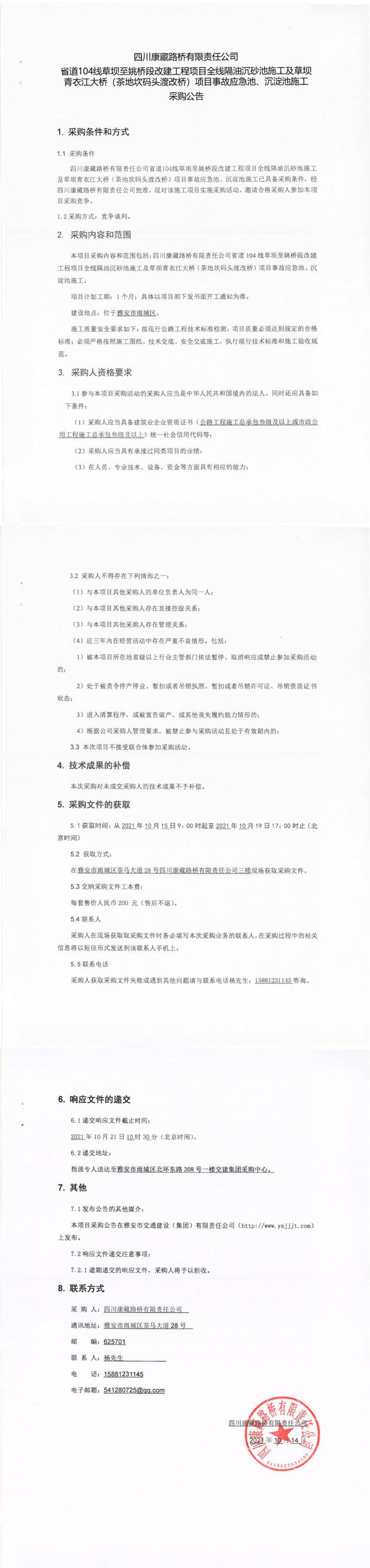四川康藏路橋有限責(zé)任公司省道104線草壩至姚橋段改建項目全線隔油沉砂池施工及草壩青衣江大橋(茶地坎碼頭渡改橋)項目事故應(yīng)急池、沉淀池施工采購公告