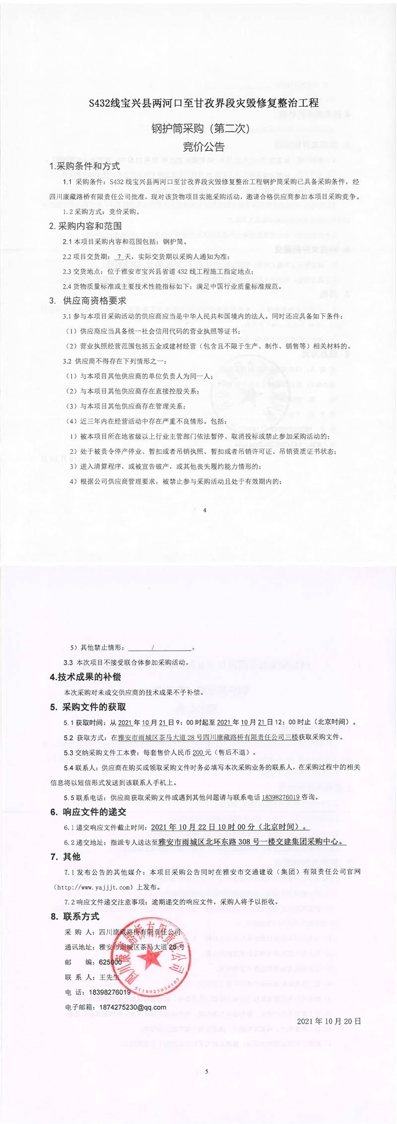 四川康藏路橋有限責(zé)任公司S432線寶興縣兩河口至甘孜界段災(zāi)毀修復(fù)整治工程鋼護(hù)筒采購(gòu)(第二次)競(jìng)價(jià)公告
