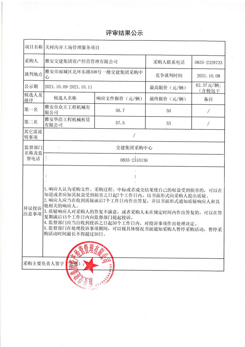 雅安交建集團資產(chǎn)經(jīng)營管理有限公司關材溝棄土場管理服務項目評審結果公示