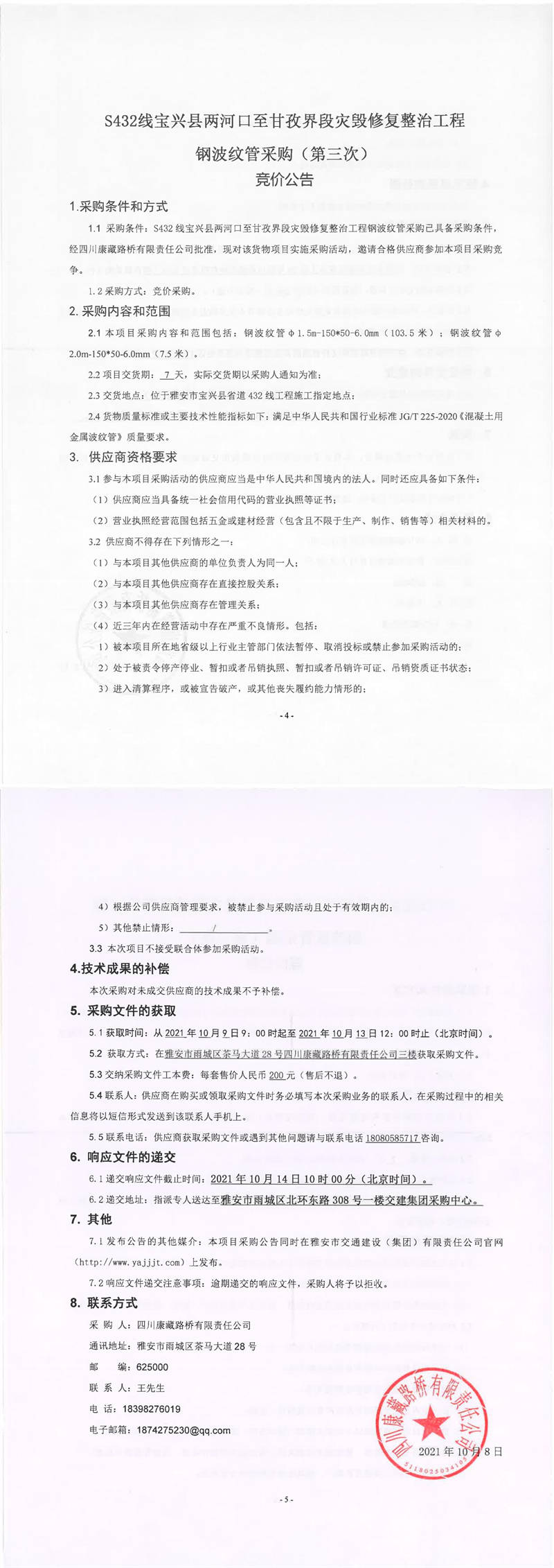 四川康藏路橋有限責(zé)任公司S432線寶興縣兩河口至甘孜界段災(zāi)毀修復(fù)整治工程鋼波紋管采購(第三次)競價公告
