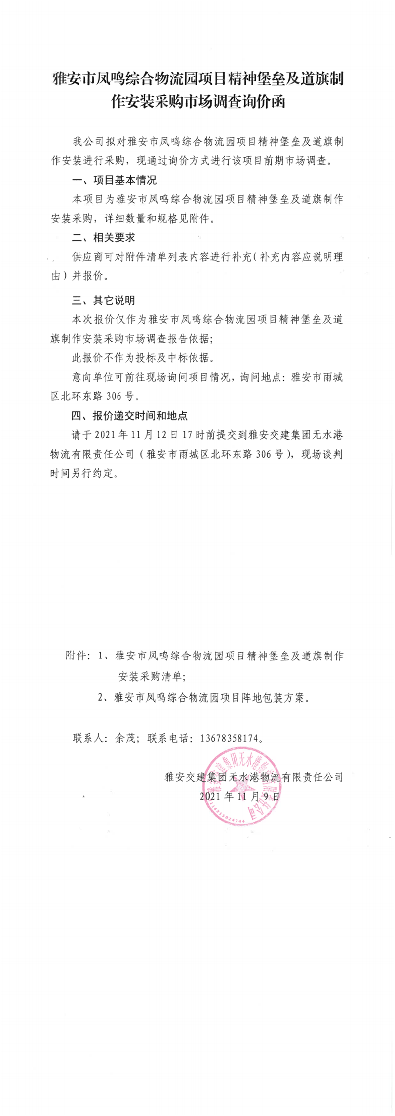 雅安交建集團(tuán)無(wú)水港物流有限責(zé)任公司雅安市鳳鳴綜合物流園項(xiàng)目精神堡壘及道旗制作安裝采購(gòu)市場(chǎng)調(diào)查詢價(jià)函