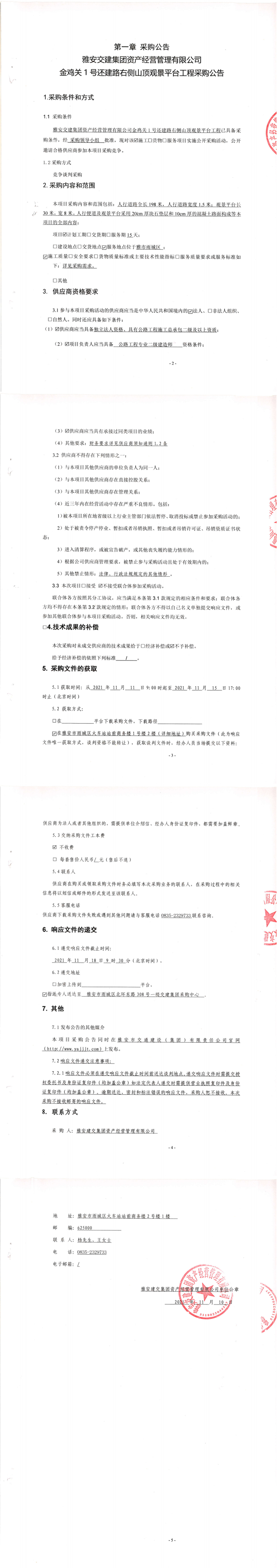 雅安交建集團資產(chǎn)經(jīng)營管理有限公司金雞關(guān)1號還建路右側(cè)山頂觀景平臺工程采購公告