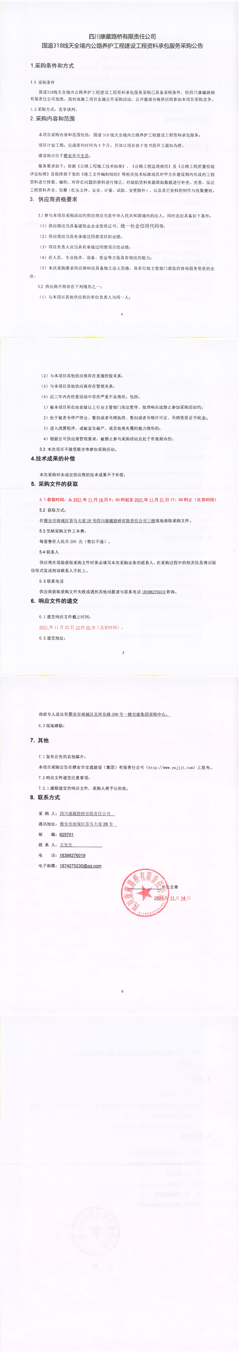 四川康藏路橋有限責任公司國道318線天全境內公路養(yǎng)護工程建設工程資料承包服務采購公告