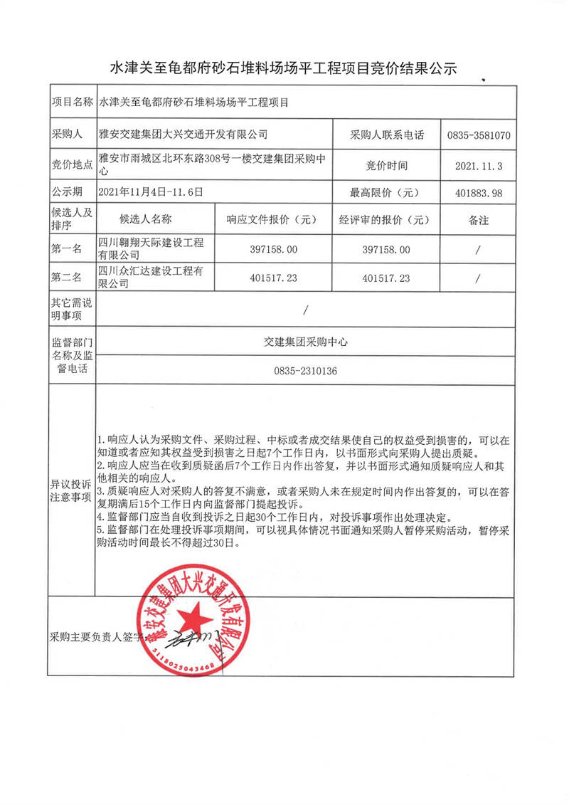 雅安交建集團大興交通開發(fā)有限公司水津關至龜都府砂石堆料場場平工程項目競價結果公示