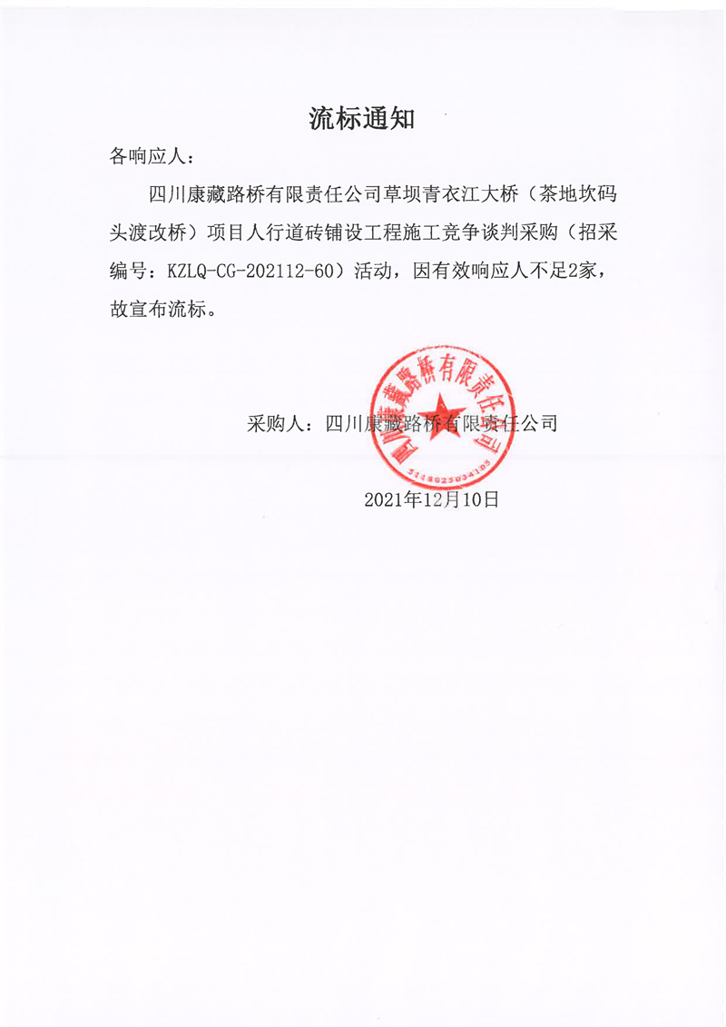 四川康藏路橋有限責(zé)任公司草壩青衣江大橋(茶地坎碼頭渡改橋)項(xiàng)目人行道磚鋪設(shè)工程施工競(jìng)爭(zhēng)談判采購流標(biāo)通知