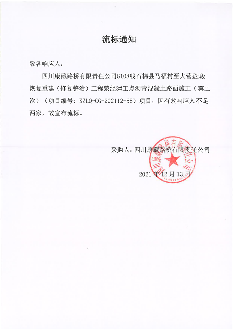 四川康藏路橋有限責(zé)任公司G108線石棉縣馬福村至大營(yíng)盤段恢復(fù)重建(修復(fù)整治)工程滎經(jīng)3#工點(diǎn)瀝青混凝土路面施工(第二次)流標(biāo)通知