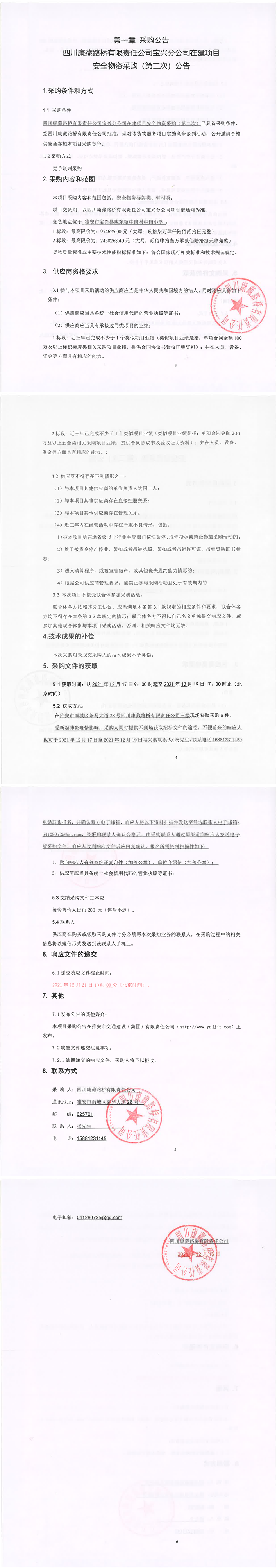 四川康藏路橋有限責(zé)任公司寶興分公司在建項目安全物資采購(第二次)公告