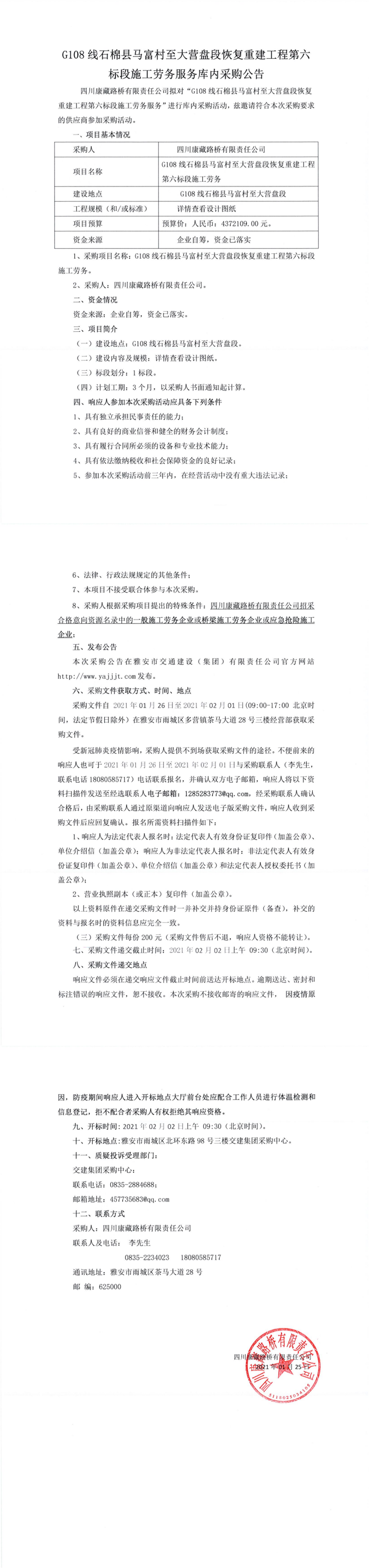 四川康藏路橋有限公司G108線石棉縣馬富村至大營盤段恢復重建工程第六標段施工勞務服務庫內(nèi)采購公告