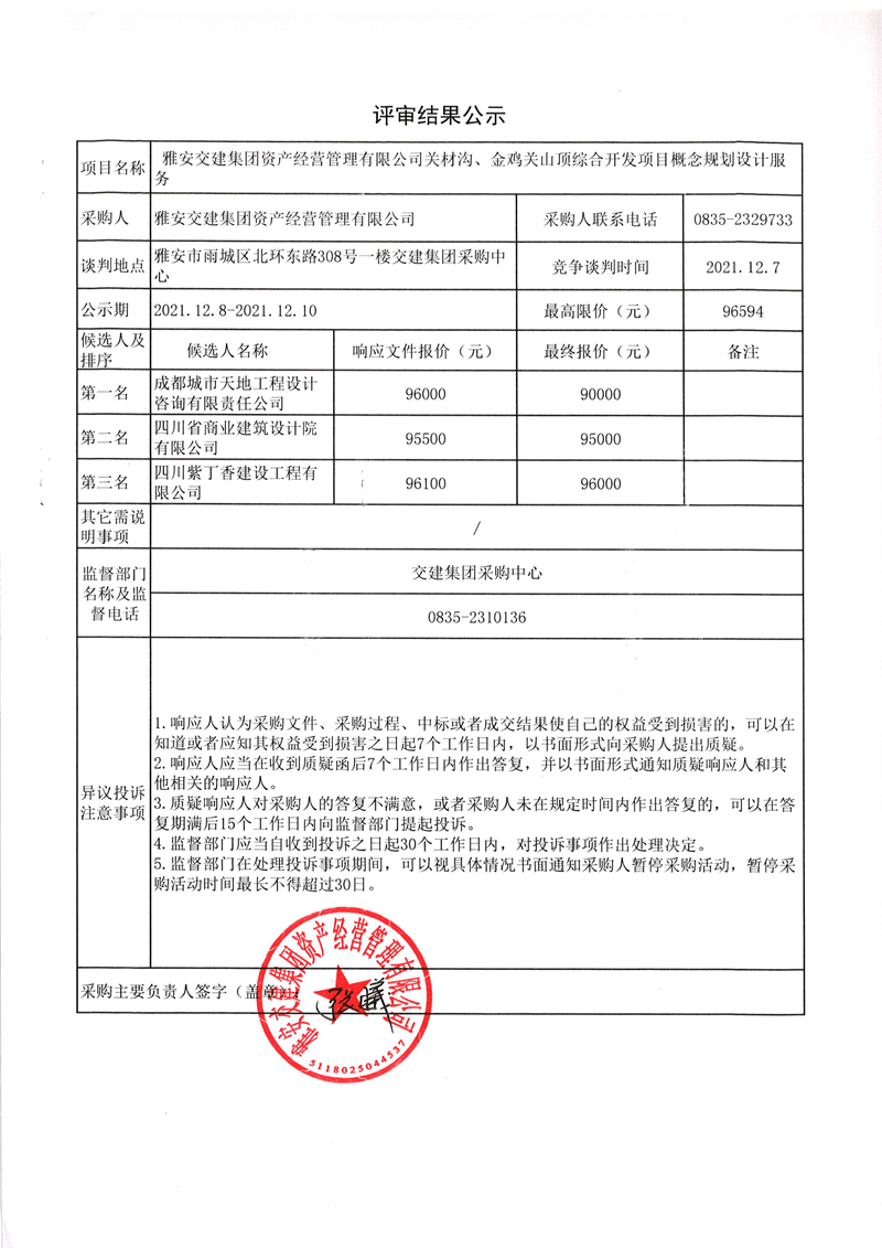 雅安交建集團資產(chǎn)經(jīng)營管理有限公司關材溝、金雞關山頂綜合開發(fā)項目概念規(guī)劃設計服務評審結果公示