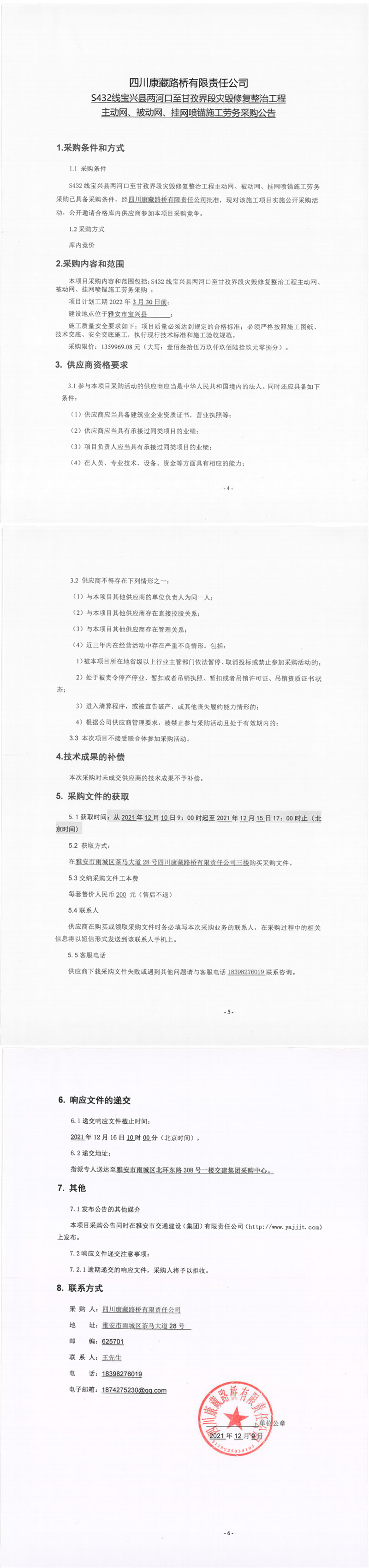 四川康藏路橋有限責任公司S432線寶興縣兩河口至甘孜界段災毀修復整治工程主動網(wǎng)、被動網(wǎng)、掛網(wǎng)噴錨施工勞務采購公告