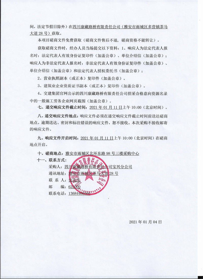 四川康藏路橋有限責(zé)任公司寶興分公司省道432線雅安段擴建工程K19新建拌合站施工勞務(wù)磋商公告