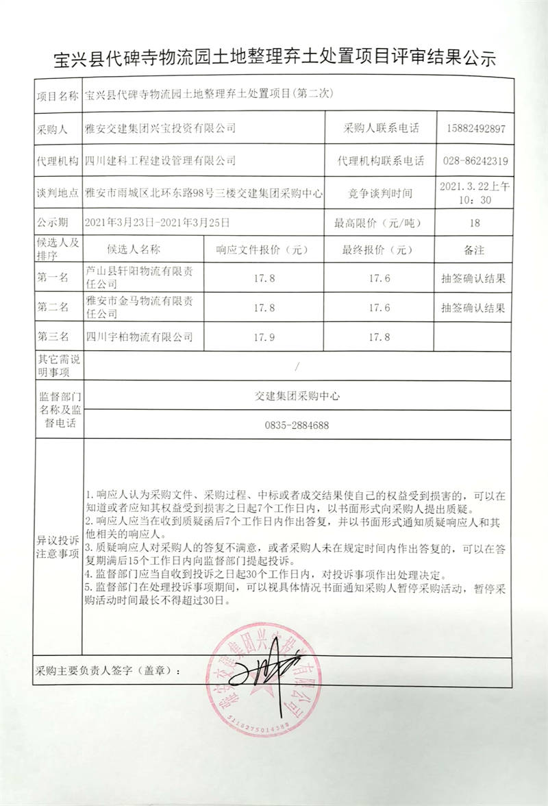 雅安交建集團(tuán)興寶投資有限公司寶興縣代碑寺物流園土地整理?xiàng)壨撂幹庙?xiàng)目評(píng)審結(jié)果公示
