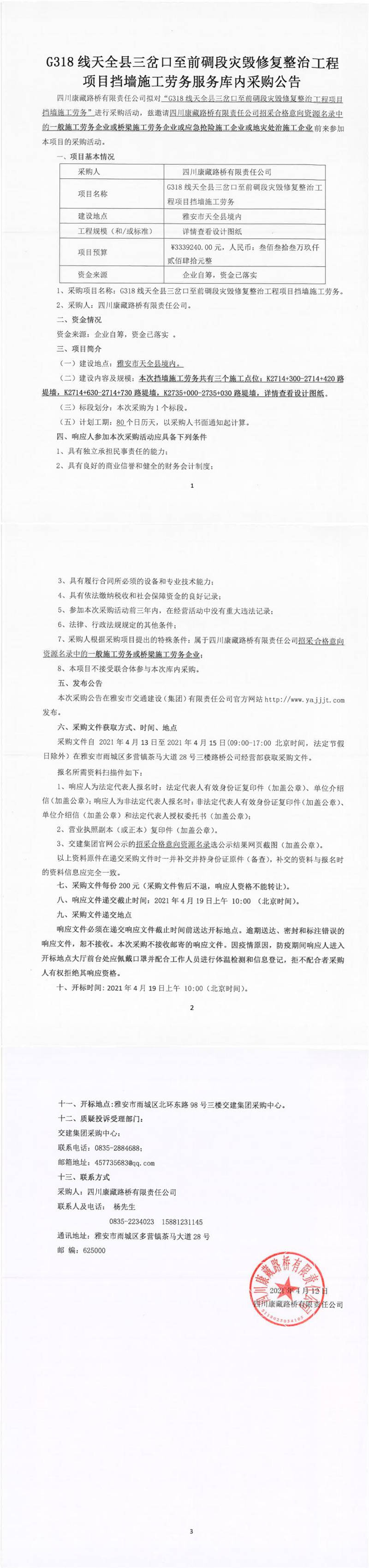 四川康藏路橋有限責(zé)任公司G318線天全縣三岔口至前碉段災(zāi)毀修復(fù)整治工程項(xiàng)目擋墻施工勞務(wù)服務(wù)庫(kù)內(nèi)采購(gòu)公告