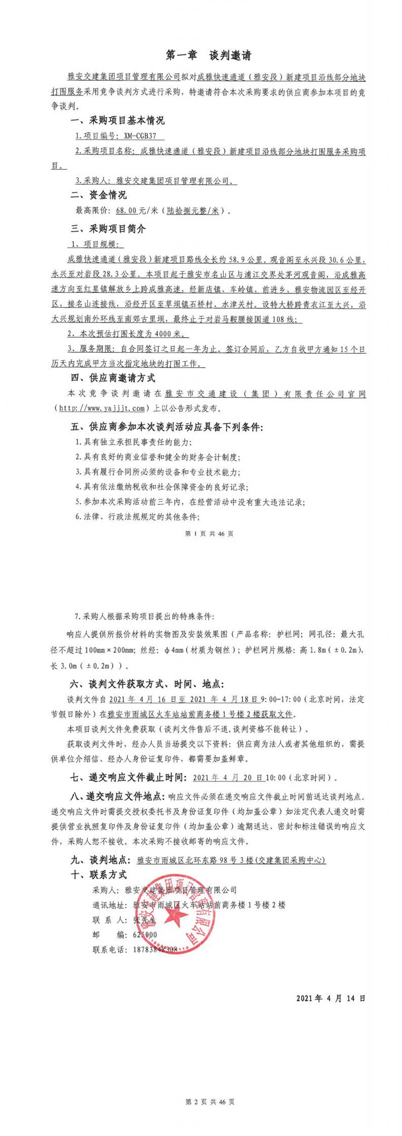 雅安交建集團項目管理有限公司成雅快速通道(雅安段)新建項目沿線部分地塊打圍服務(wù)采購項目競爭談判公告