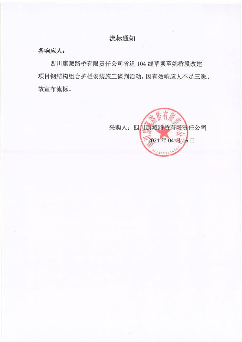 四川康藏路橋有限責(zé)任公司省道104線草壩至姚橋段改建項目鋼結(jié)構(gòu)組合護欄安裝施工流標通知