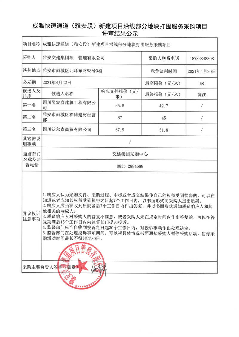 雅安交建集團(tuán)項(xiàng)目管理有限公司成雅快速通道(雅安段)新建項(xiàng)目沿線部分地塊打圍服務(wù)采購項(xiàng)目評(píng)審結(jié)果公示