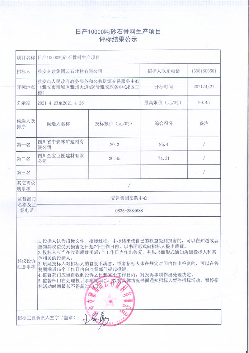 雅安交建集團(tuán)云石建材有限公司日產(chǎn)10000噸砂石骨料生產(chǎn)項目評標(biāo)結(jié)果公示