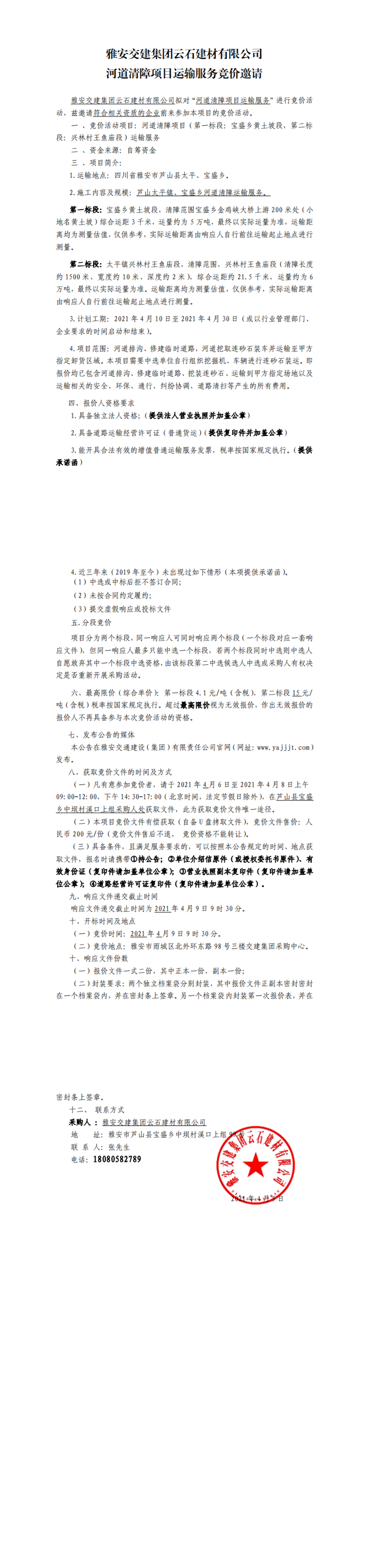 雅安交建集團(tuán)云石建材有限公司河道清障項(xiàng)目運(yùn)輸服務(wù)競價公告