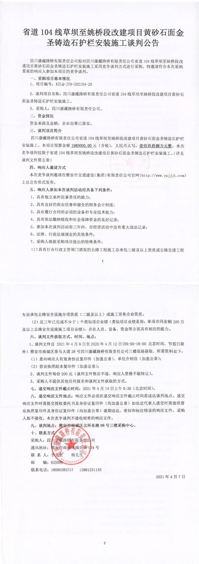 四川康藏路橋有限責(zé)任公司省道104線草壩至姚橋段改建項(xiàng)目黃砂石面金圣鑄造石護(hù)欄安裝施工談判公告