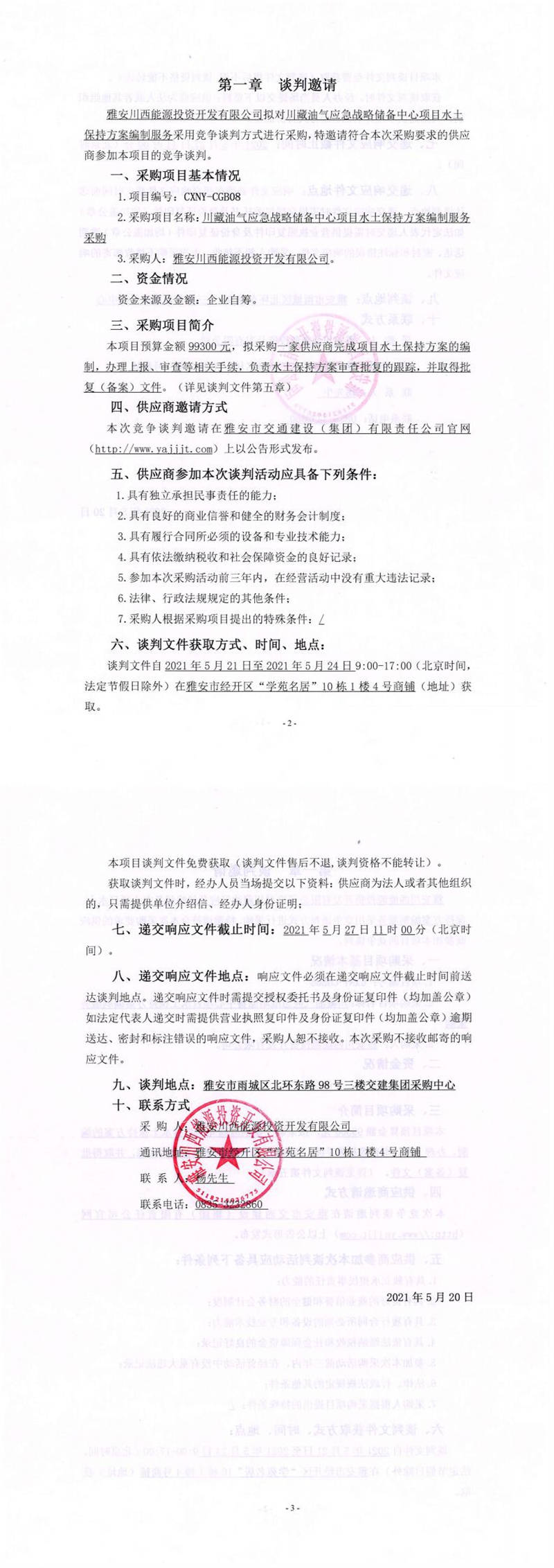 雅安川西能源投資開(kāi)發(fā)有限公司川藏油氣應(yīng)急戰(zhàn)略?xún)?chǔ)備中心項(xiàng)目水土保持方案編制服務(wù)采購(gòu)競(jìng)爭(zhēng)談判公告