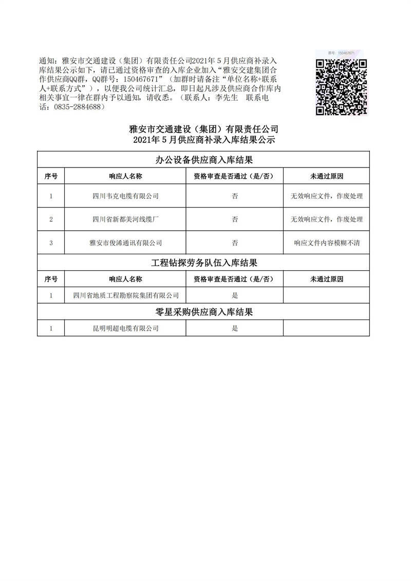 雅安市交通建設(shè)(集團)有限責(zé)任公司2021年5月供應(yīng)商補錄入庫結(jié)果公示