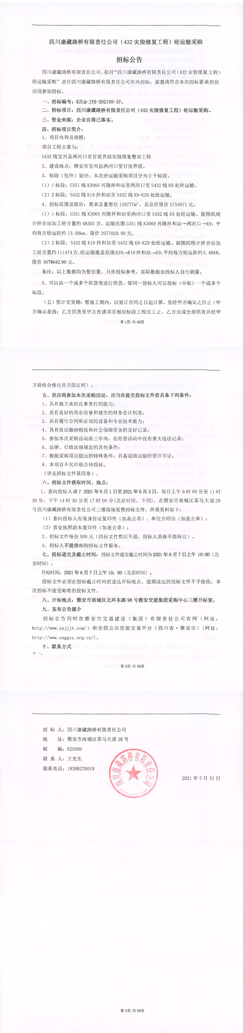 四川康藏路橋有限責任公司(432災毀修復工程)砼運輸采購招標公告