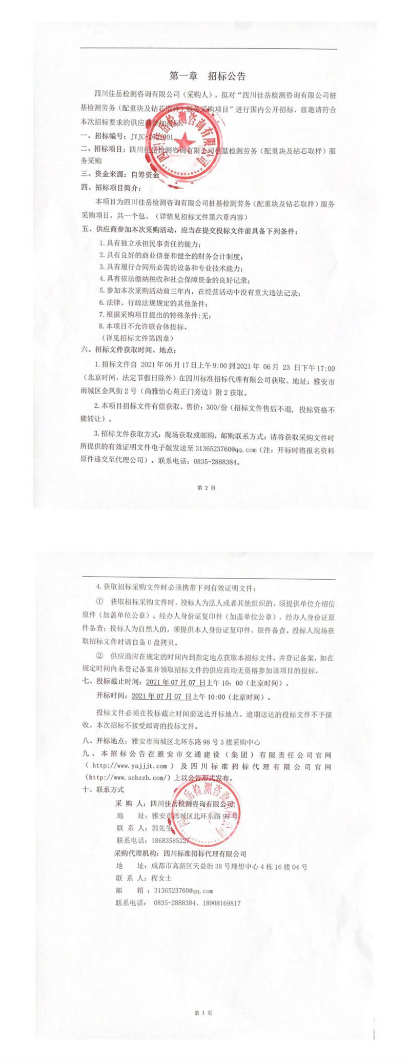 四川佳岳檢測(cè)咨詢有限公司樁基檢測(cè)勞務(wù)(配重塊及鉆芯取樣)服務(wù)采購(gòu)招標(biāo)公告