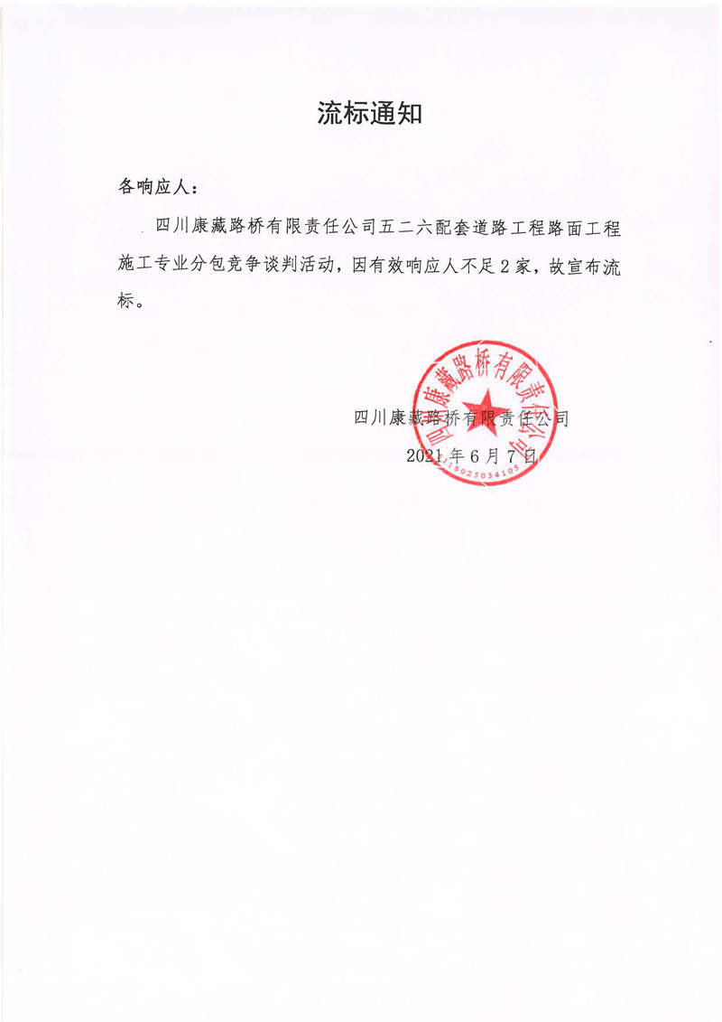 四川康藏路橋有限責(zé)任公司五二六配套道路工程路面工程施工專(zhuān)業(yè)分包競(jìng)爭(zhēng)談判流標(biāo)通知