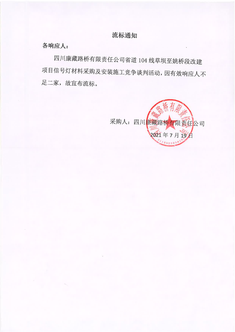 四川康藏路橋有限責任公司省道104線草壩至姚橋段改建項目信號燈材料采購及安裝施工競爭談判流標通知