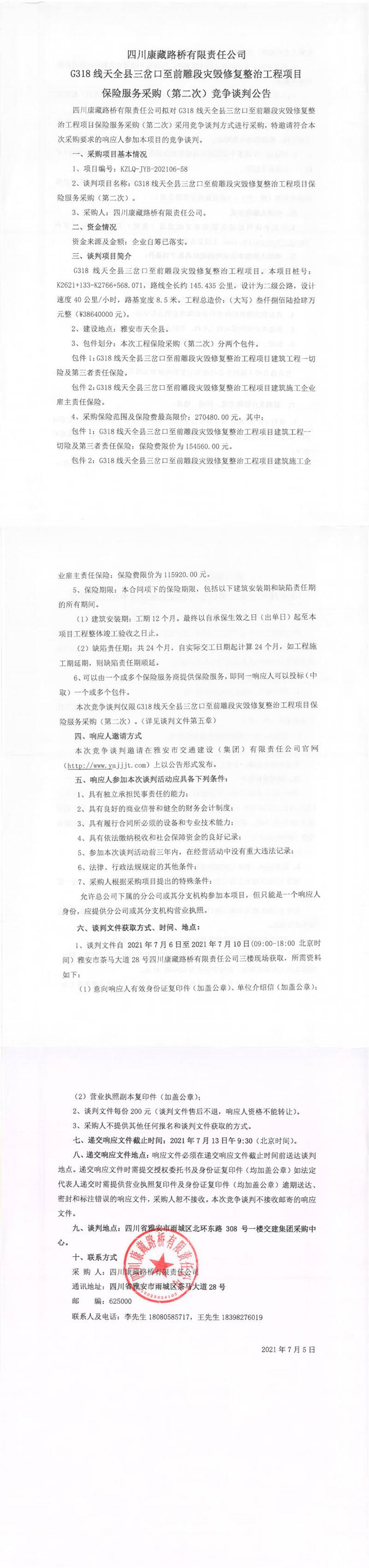 四川康藏路橋有限責(zé)任公司G318線天全縣三岔口至前雕段災(zāi)毀修復(fù)整治工程項目保險服務(wù)采購(第二次)競爭談判公告