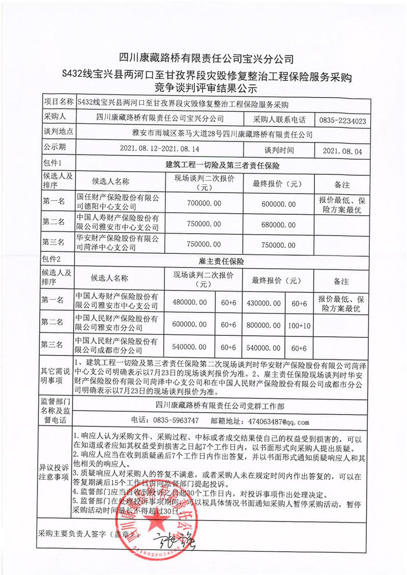 四川康藏路橋有限責任公司寶興分公司S432線寶興縣兩河口至甘孜界段災(zāi)毀修復(fù)整治工程保險服務(wù)采購競爭談判評審結(jié)果公示