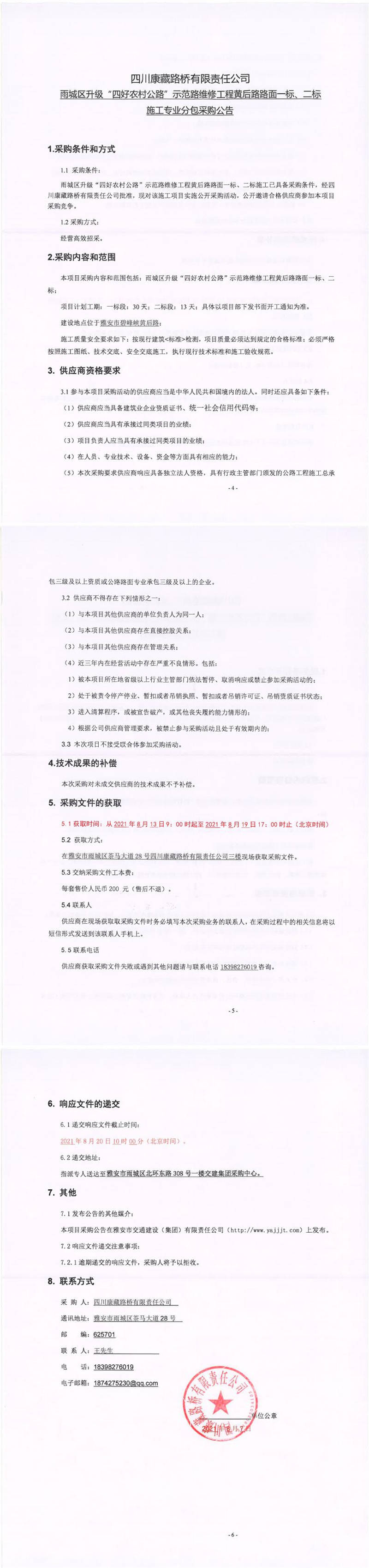 四川康藏路橋有限責(zé)任公司雨城區(qū)升級(jí)“四好農(nóng)材公路”示范路維修工程黃后路路面一標(biāo)、二標(biāo)施工專業(yè)分包采購公告