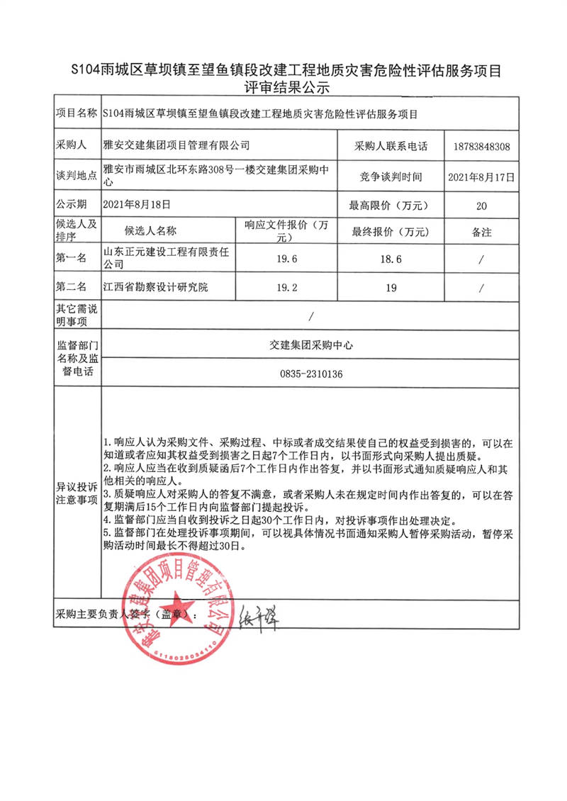 雅安交建集團項目管理有限公司S104雨城區(qū)草壩鎮(zhèn)至望魚鎮(zhèn)改建工程地質(zhì)災(zāi)害危險性評估服務(wù)項目評審結(jié)果公示