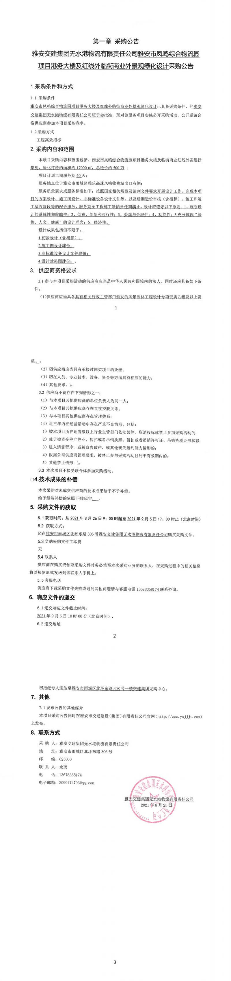 雅安交建集團(tuán)無水港物流有限責(zé)任公司雅安市鳳鳴綜合物流園項(xiàng)目港務(wù)大樓及紅線外臨街商業(yè)外景觀綠化設(shè)計(jì)采購公告