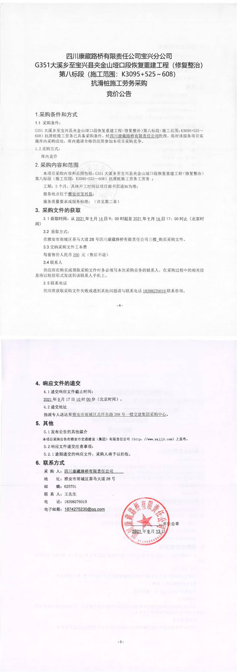四川康藏路橋有限責任公司寶興分公司G351大溪鄉(xiāng)至寶興縣夾金山埡口段恢復(fù)重建工程(修復(fù)整治)第八標段(施工范圍:K3095+525-608)抗滑樁施工勞務(wù)采購競價公告