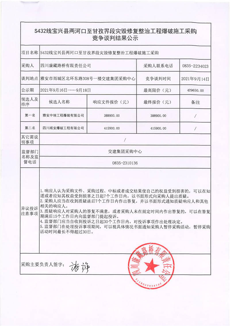 四川康藏路橋有限責任公司S432線寶興縣兩河口至甘孜界段災毀修復整治工程爆破施工采購競爭談判結(jié)果公示