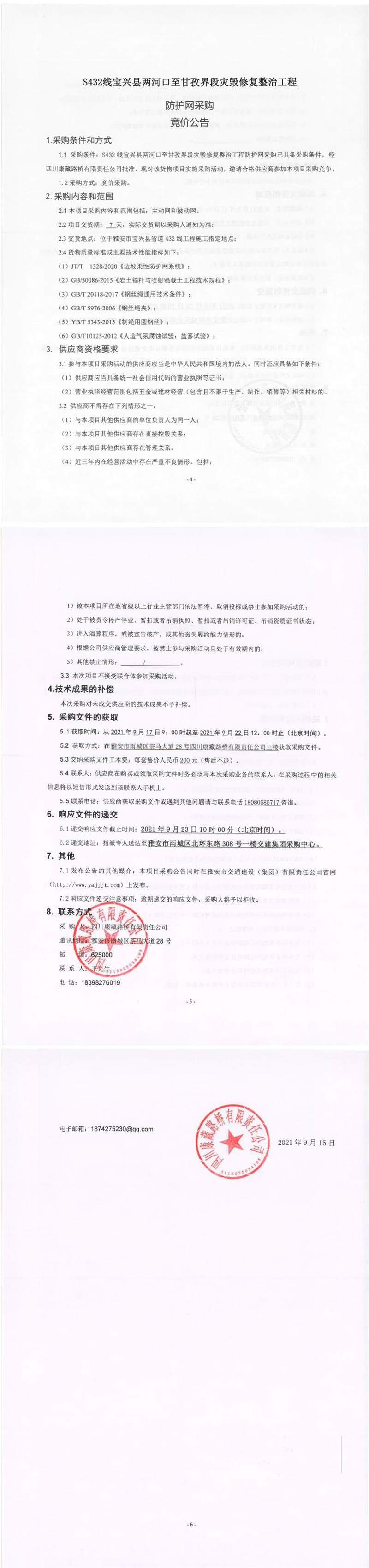 四川康藏路橋有限責(zé)任公司S432線寶興縣兩河口至甘孜界段災(zāi)毀修復(fù)整治工程防護(hù)網(wǎng)采購競價(jià)公告
