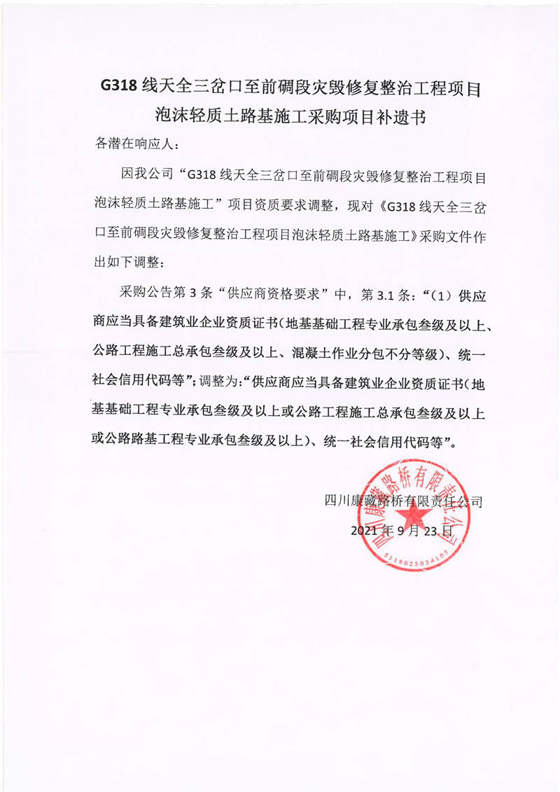 四川康藏路橋有限責(zé)任公司G318線天全三岔口至前碉段災(zāi)毀修復(fù)整治工程項目泡沫輕質(zhì)土路基施工采購項目補(bǔ)遺書