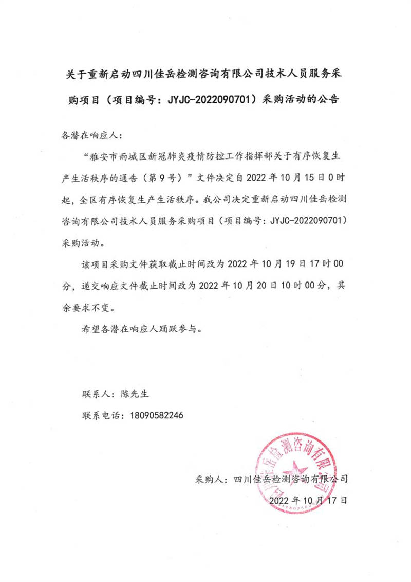 四川佳岳檢測(cè)咨詢有限公司關(guān)于重新啟動(dòng)四川佳岳檢測(cè)咨詢有限公司技術(shù)人員服務(wù)采購(gòu)項(xiàng)目(項(xiàng)目編號(hào):JYJC-2022090701)采購(gòu)活動(dòng)的公告