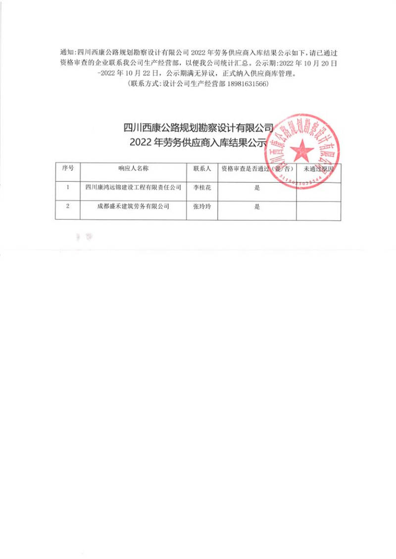 四川西康公路規(guī)劃勘察設計有限公司2022年勞務供應商入庫結果公示