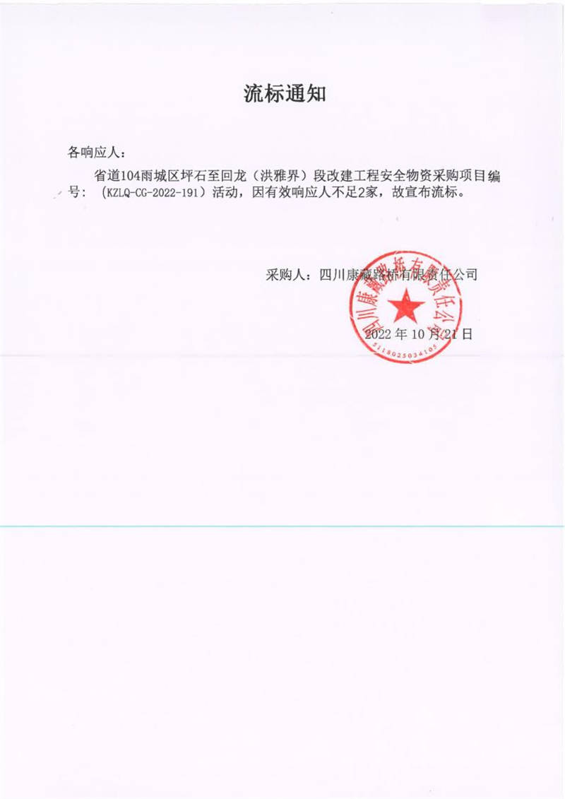四川康藏路橋有限責(zé)任公司省道104雨城區(qū)坪石至回龍(洪雅界)段改建工程項(xiàng)目安全物資采購項(xiàng)目流標(biāo)通知