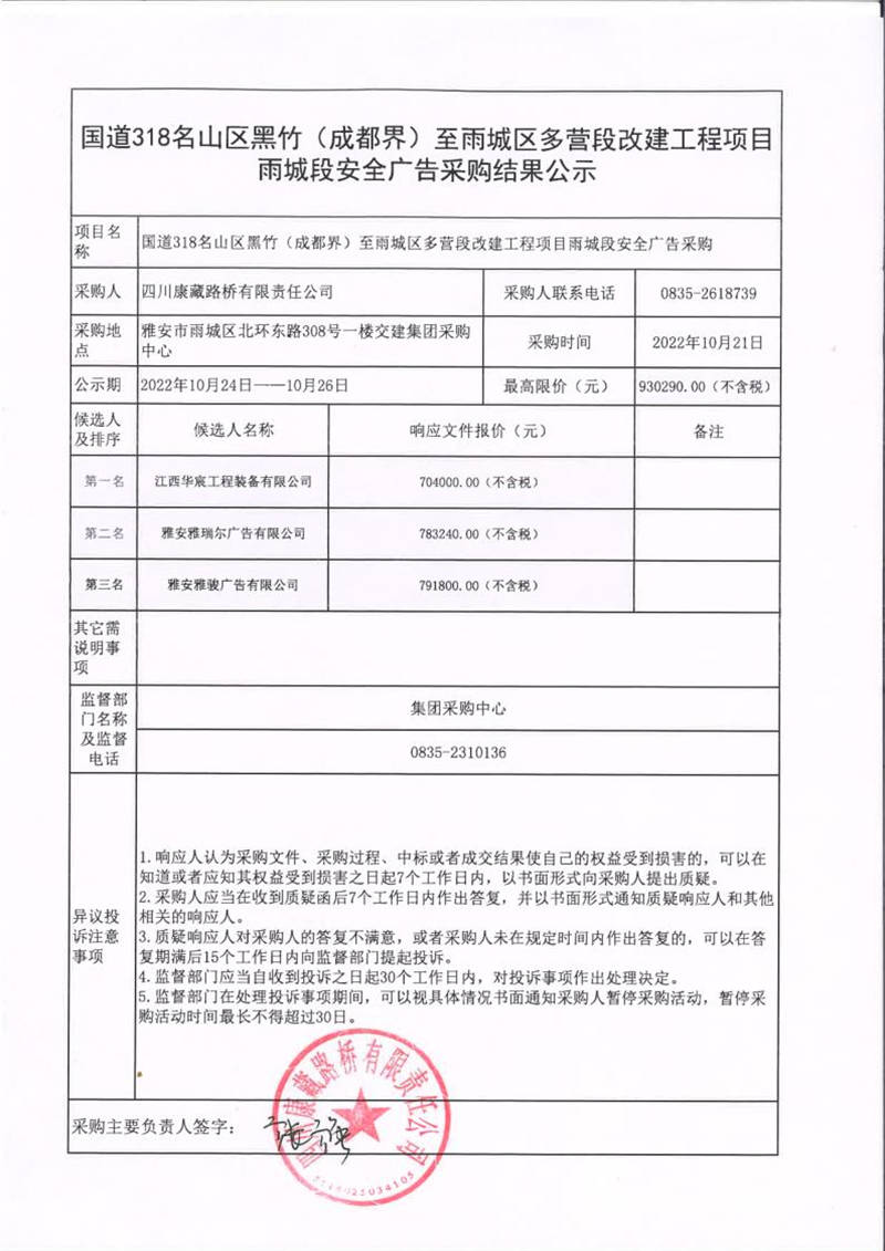 四川康藏路橋有限責(zé)任公司國道318名山區(qū)黑竹(成都界)至雨城區(qū)多營段改建工程項(xiàng)目雨城段安全廣告采購結(jié)果公示