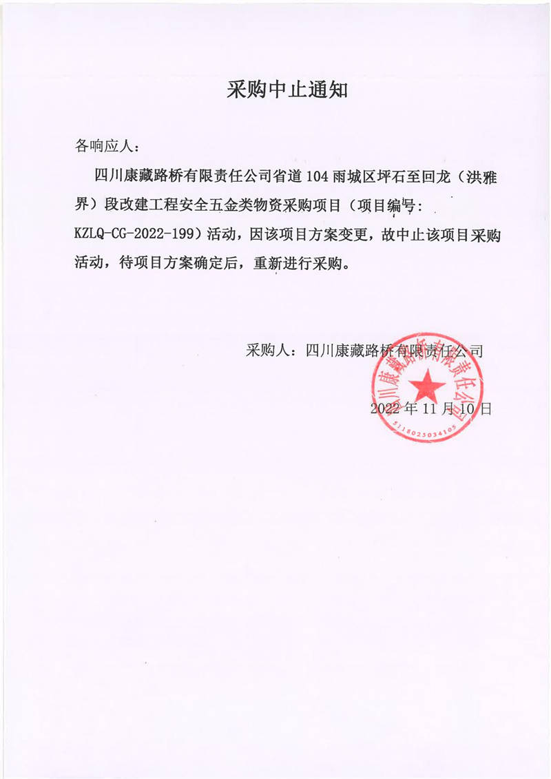 四川康藏路橋有限責(zé)任公司省道104雨城區(qū)坪石至回龍(洪雅界)段改建工程安全五金類物資采購項目采購中止通知
