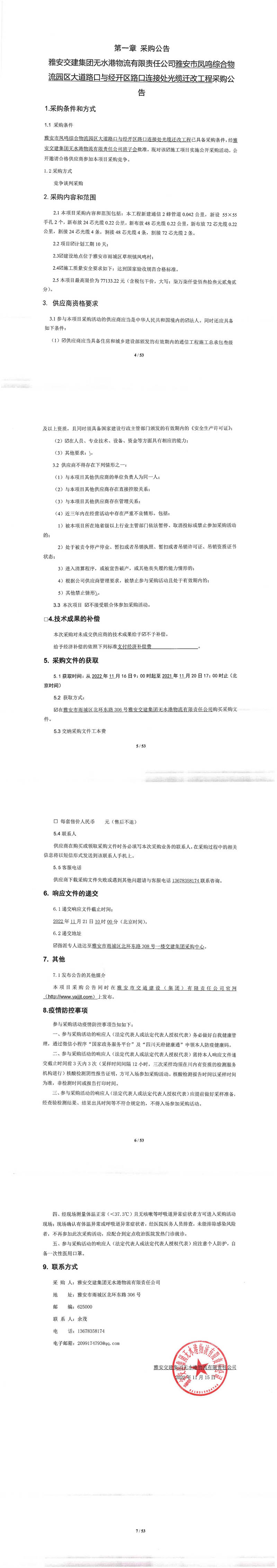 雅安交建集團(tuán)無水港物流有限責(zé)任公司雅安市鳳鳴綜合物流園區(qū)大道路口與經(jīng)開區(qū)路口連接處光纜遷改工程采購公告