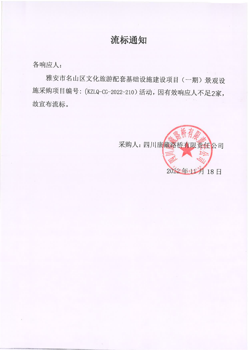 四川康藏路橋有限責(zé)任公司雅安市名山區(qū)文化旅游配套基礎(chǔ)設(shè)施建設(shè)項目(一期)景觀設(shè)施采購項目流標(biāo)通知